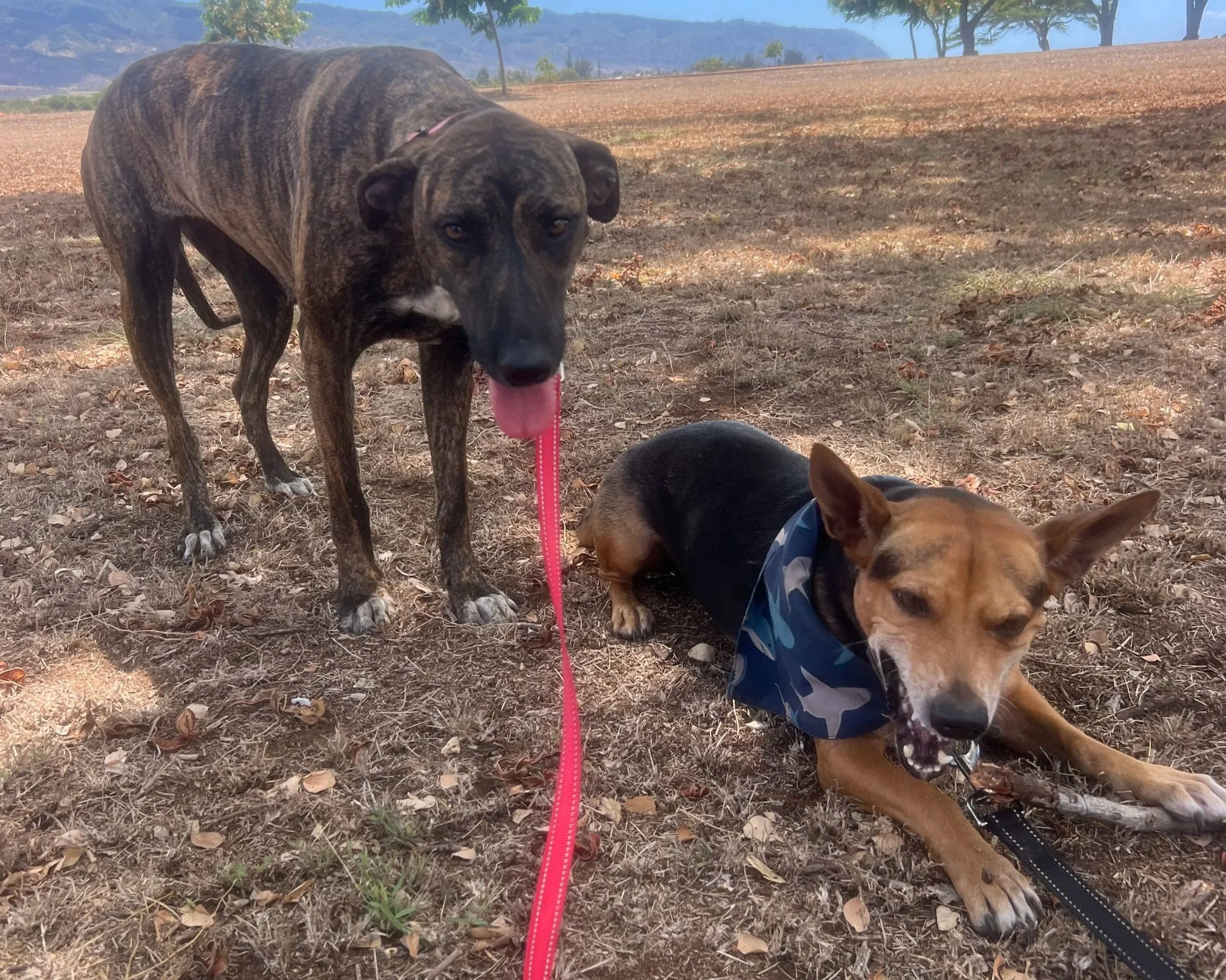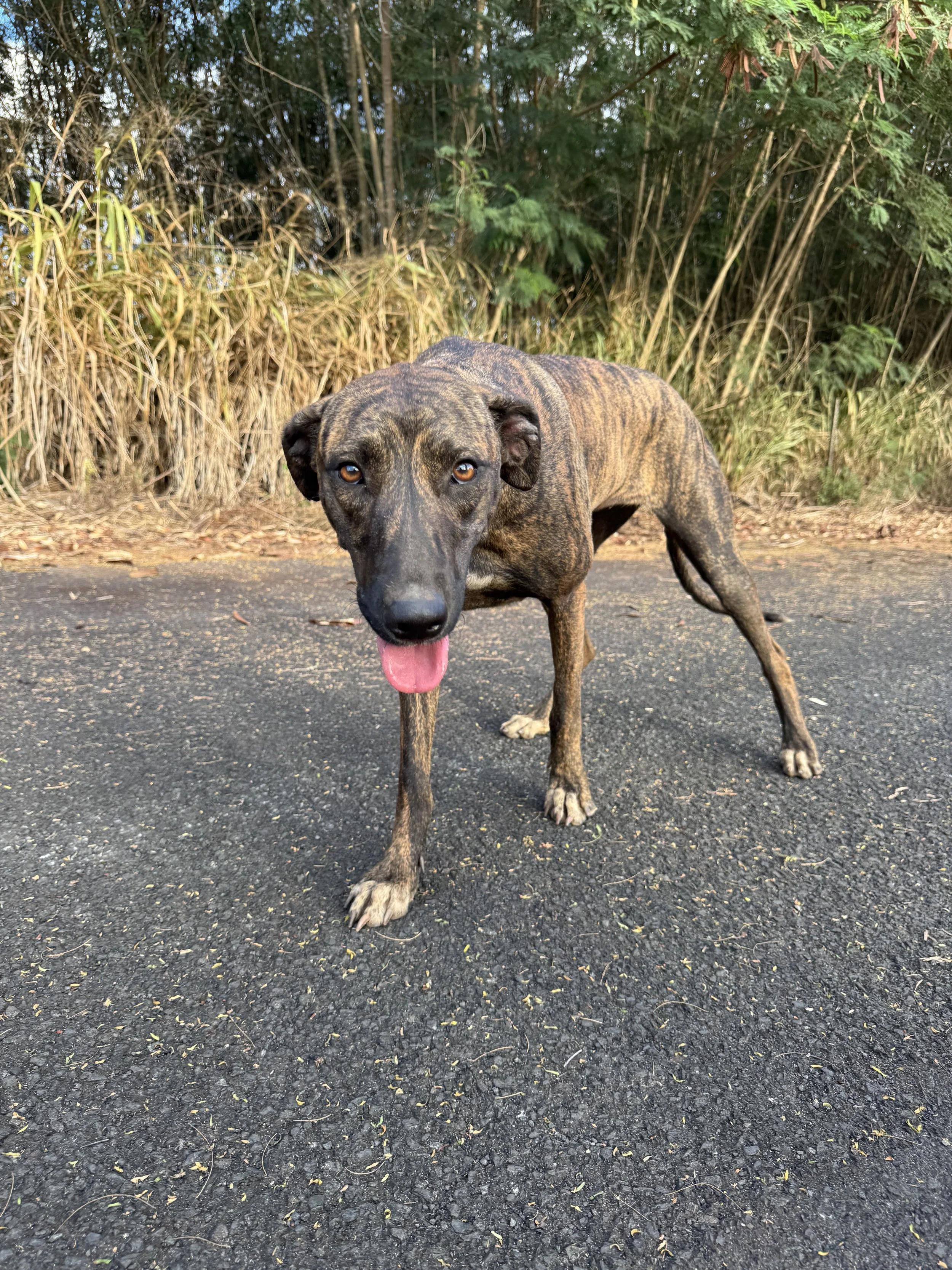On August 3rd, 2025, Tyler and Machi from SUPDog Hawaii were enjoying an evening Hike in Mokuleia on the North Shore of Oahu, when a beautiful brindle Hawaiian Hound walked out of the bushes and onto the trail in front of them.